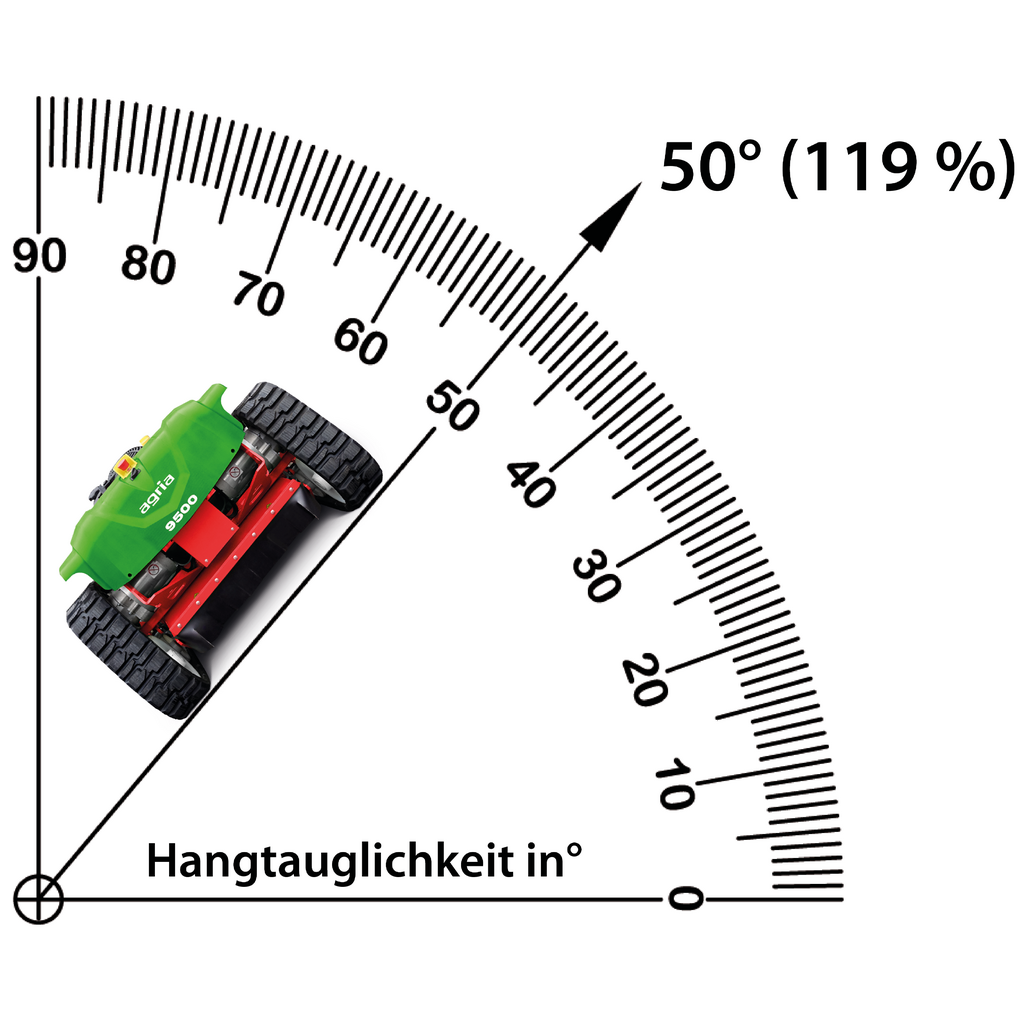 Mit dem agria 9500-90 wurde die Raupenmäher-Baureihe der agria 9500 um ein Hochleistungsmodell mit 90 cm Arbeitsbreite erweitert. Dies steigert die Effizienz der ohnehin schon leistungsstarken Maschinen weiter. Mit einem 24 PS starken Kawasaki-Motor und einem Neigungswinkel von bis zu 50° eignet sich die Maschine ideal für die Bearbeitung von unebenem Gelände. Die agria 9500-90 überzeugt nicht nur durch ihre große Flächenleistung, sondern auch durch die hohe Leistungsfähigkeit in dichtem Gestrüpp und mehrjährigem Bewuchs. Die Fernbedienung mit Neigungssensor schützt den Bediener jederzeit vor direkten Belastungen wie Vibrationen, Lärm und Abgasen. Genau wie die „kleinen Brüder“ agria 9500-80 und agria 9500-70 ist die agria 9500-90 mit wartungsfreien, bürstenlosen Elektromotoren und Generator ausgestattet und arbeitet durch den Elektro-Hybrid-Antrieb kraftstoffsparend und mit einem hohen Leistungsgrad. Ausgestattet mit Astabweiser und Gestrüppbügel ist der Einsatz auch in dichtem Bewuchs wie Brombeerhecken oder Jungbäumen problemlos möglich.