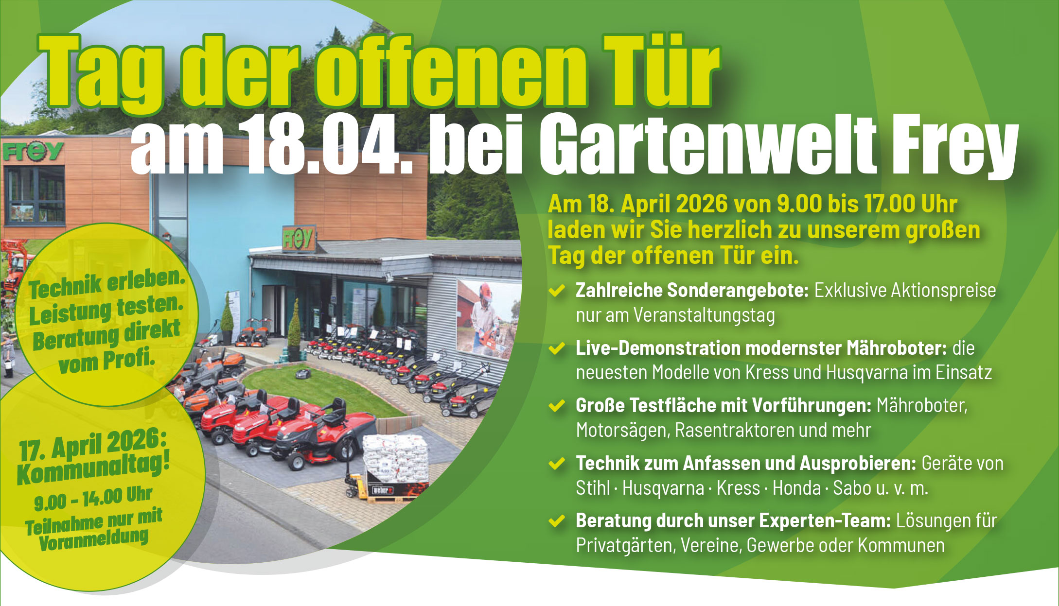 Am 17. und 18. April 2026 wird das Veranstaltungsgelände der Gartenwelt Frey GmbH & Co. KG zum zentralen Treffpunkt für innovative Land- und Kommunaltechnik.