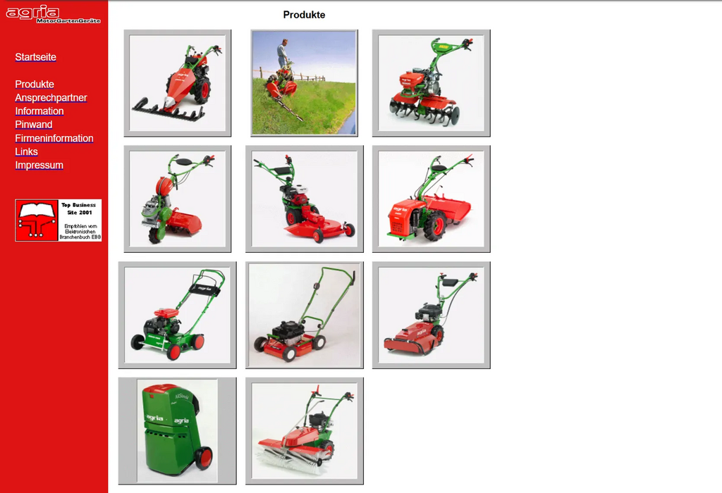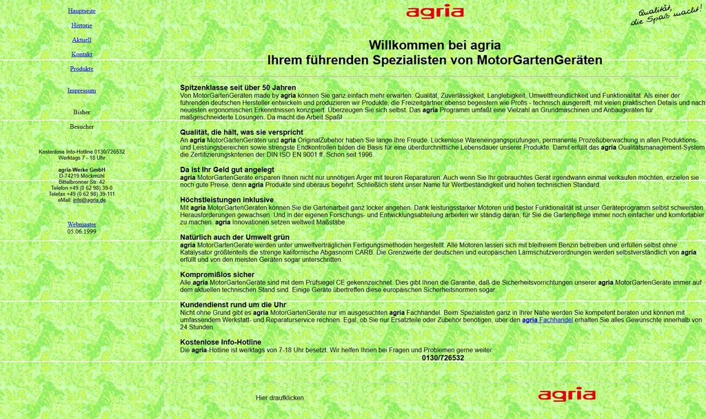 - 1998 – Der Pionier: Die erste agria-Website war noch schlicht wie ein Scheunentor, aber funktionierte wie eine agria – zuverlässig und robust.