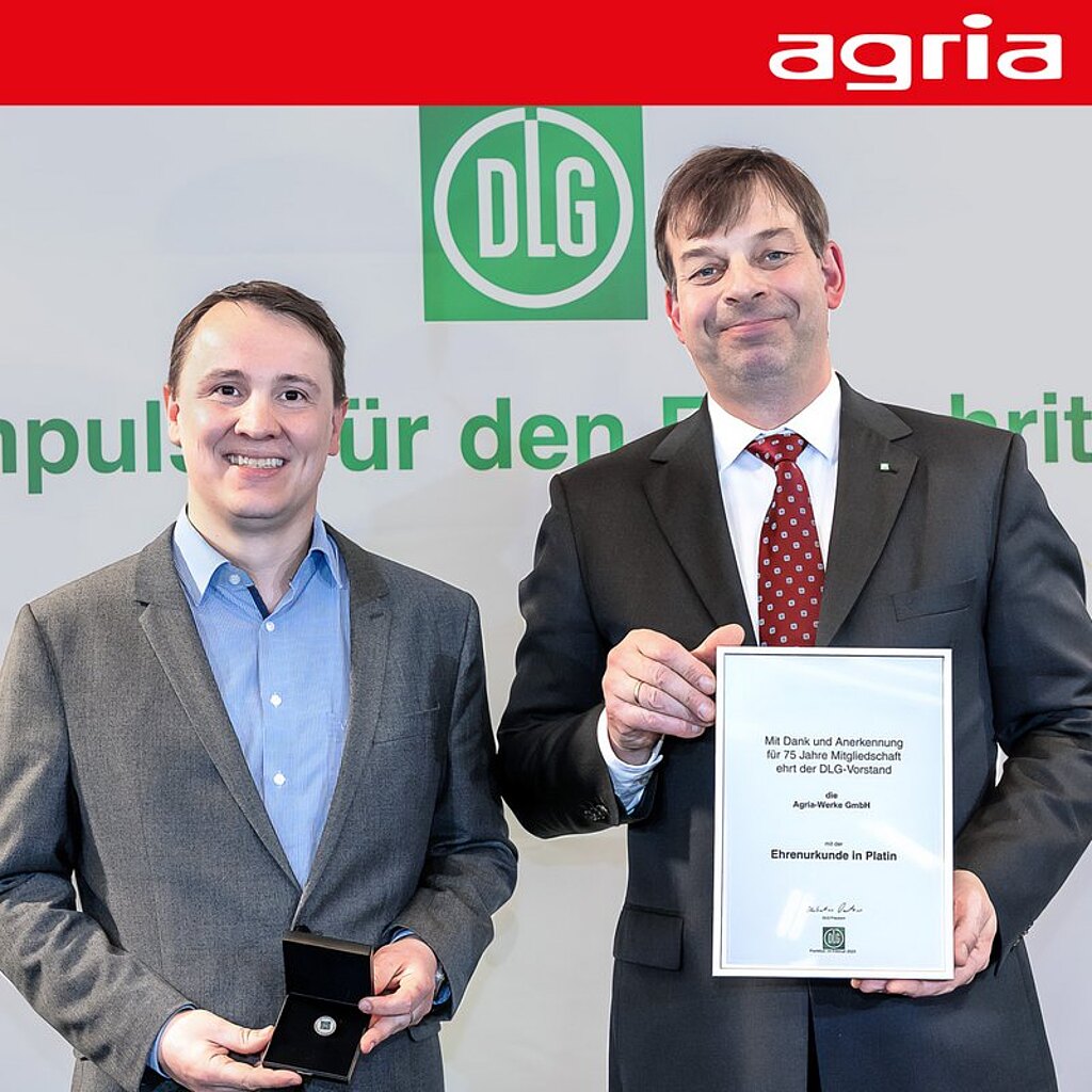 As a token of thanks and recognition for 75 years of membership, DLG President Hubertus Paetow presented the platinum certificate of honor to Dr. Goetz Viering (Managing Director Agria-Werke).