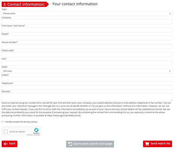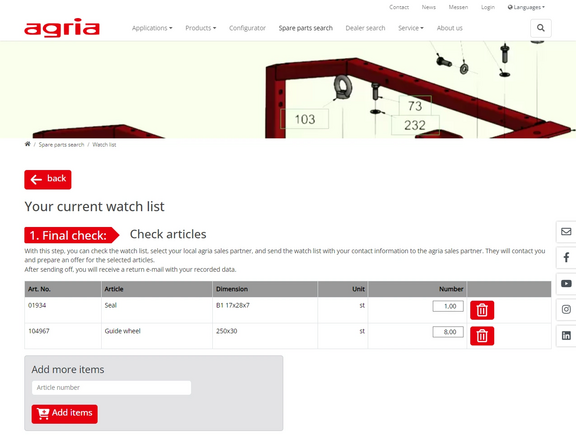 You can use the watch list symbol in the parts list to compile the items in a list for the next steps. Your order will be processed and shipped by the agria sales partner you have selected. They will then contact you and provide you with a quote for the selected items.
