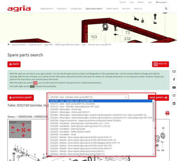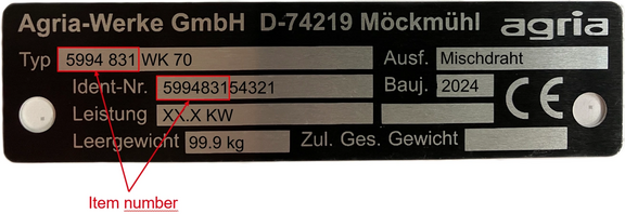 In the exploded view, you can move your mouse over the items to see the agria part number and designation of your spare part.