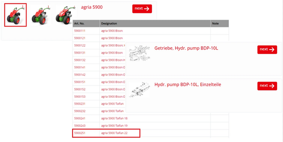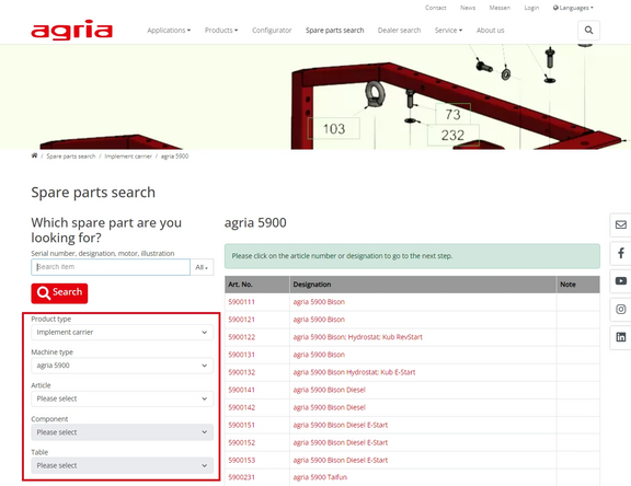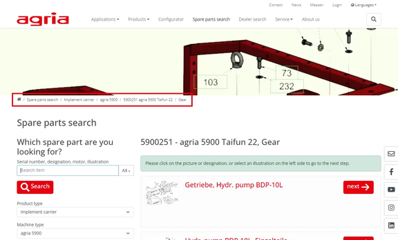 You can use the navigation bar to identify the basic implement, Implement or Accessories for which you require spare parts. To do this, click on the selection fields from above to below until you see the exploded view with the spare parts.