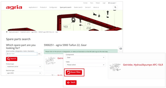 To go directly to the home page, click on "Spare parts search" in the navigation bar or on the "Reset filter" button.