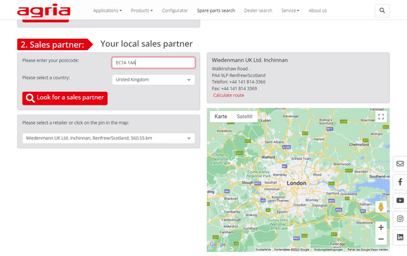 Then select your nearest agria sales partner. You can either do this via the selection list or by clicking on the red pin on the map.